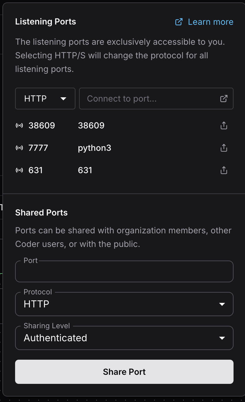 <img src="https://cdn.ozteklab.com/uploads/coder-screenshots/05-coder-port-forwarding.png" alt="Port forwarding panel" style={{maxWidth: '450px', width: '100%', height: 'auto', display: 'block', margin: '0 auto'}} />